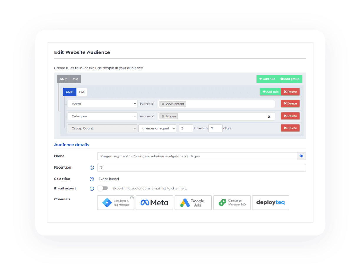 Met alle data die jij verzamelt, bouw je eenvoudig relevante doelgroepen op. Dit doe je met de Audience Builder waarbij jij bepaalt hoe jij jouw doelgroep wilt inrichten. Aan deze doelgroepen kun je vervolgens voor hen relevante acties linken of je zet ze door naar verschillende communicatieplatforms.