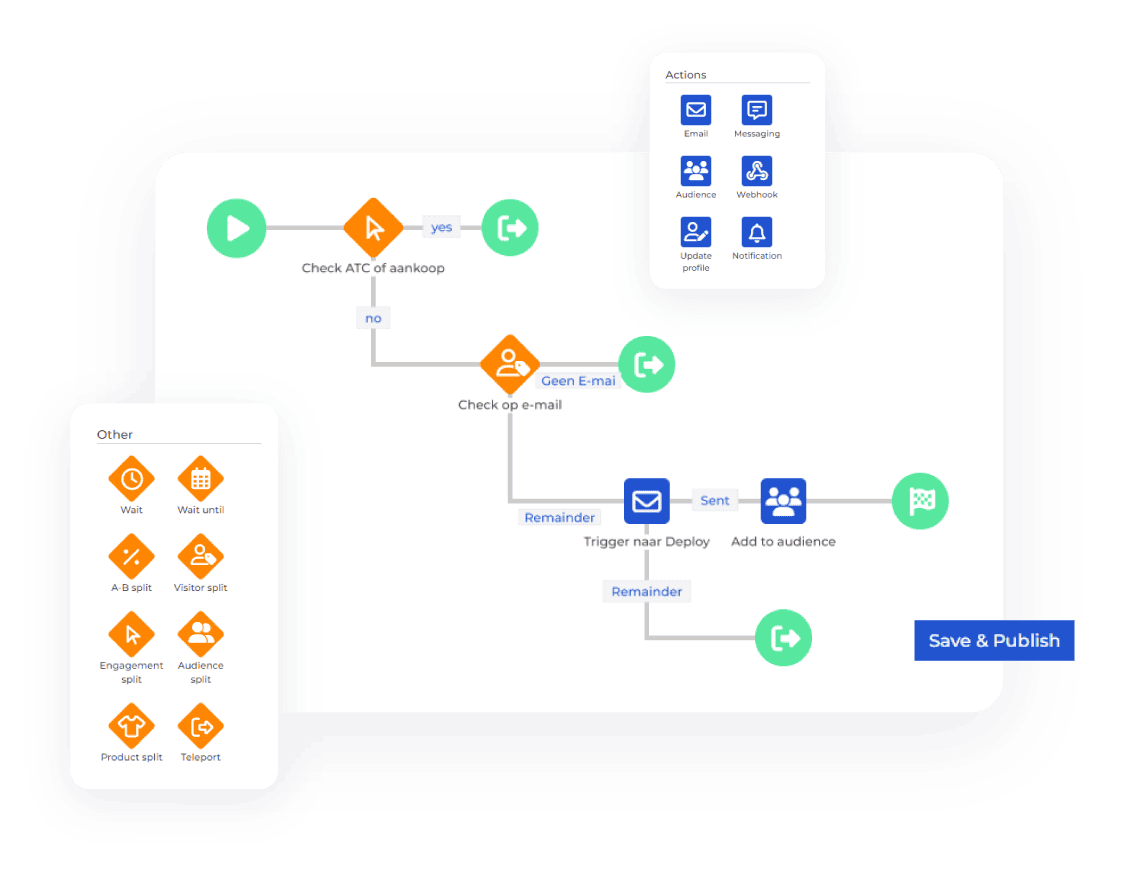 Drag & drop maakt het bouwen van een journey voor jouw bezoekers erg eenvoudig. Voor ieder scenario creëer je zo het gewenste pad met verschillende triggers en acties.